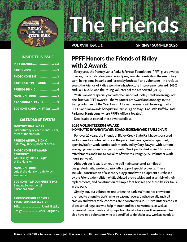 The Friends of Ridley Creek State Park are happy to see another popular tradition live on with the 2026 Photo Contest. Coming this summer, this event will continue to add to the many beautiful park photographs and perspectives collected over the years. It is always neat to see the park through the lens of other park enthusiasts. Two decades of past entries can be seen on this website by clicking on the Photo Contest panel on the left side of the home page. Photos from past contests also appear at various events and make occasional newsletter appearances.